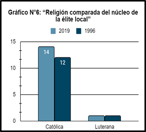La religión evangélica en ambos períodos tiene ausencia en el núcleo. A 2019 un 57% profesa alguna religión y a 1996 un 52%. Al respecto no se debe confundir la adscripción religiosa de los integrantes de la élite, con el poder o influencia que pudieran tener los credos religiosos.
