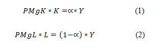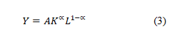 Donde α se define como el nivel de inversión de capital en la producción total y tiene un valor entre 0 y 1. Al ser una función Cobb-Douglas la participación del trabajo es complementaria, por lo que su valor se determina a partir de 1-α. En este sentido, y de acuerdo con lo planteado, la función de producción se expresa con la siguiente ecuación (figura 2).