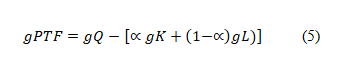 En este sentido, se puede observar que un aumento en el nivel de producción conduce a una disminución en el retorno al empleo, lo que a su vez restablece un aumento en el retorno según el comportamiento del desarrollo tecnológico. Desde esta perspectiva, las estrategias implementadas como parte de las iniciativas de política económica del gobierno se reflejan en tasas de crecimiento y, por ende, en el bienestar de la población del país. Según la ecuación (5), en la que se estima la PTF, se puede expresar que el aumento de la productividad en un sector se correlaciona positivamente con toda la industria. Por esto, la forma para calcular la tasa de crecimiento se define de la siguiente manera (figura 6):