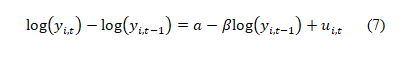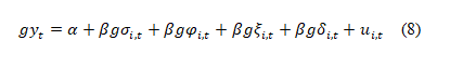 Donde i es el sector manufacturero que va desde 1 hasta N. La velocidad de crecimiento de la PTF de un país, i, el año inicial, t-1, y el año final del período de estudio, t, se obtiene a partir de yi,t = log (yi,t) - log (yi,t-1). Finalmente, ui,t es un término que mide las variaciones temporales de la función de producción y ( es un término positivo tal que 0 < ( < 1. Cuanto mayor sea el valor de este coeficiente mejor será el desempeño del sector. Una vez determinado el método para derivar la tasa de crecimiento de la PTF, el modelo de datos de panel utilizado en este estudio se puede expresar mediante la siguiente ecuación (figura 7):