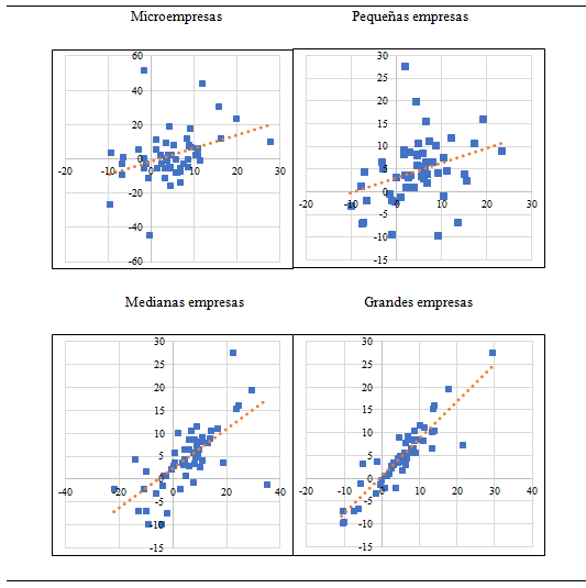 Ratificando lo anterior, la gráfica 8 muestra la relación entre la tasa de crecimiento de la productividad total de los factores a nivel manufacturas con la tasa de crecimiento observada por tipo de estructura empresarial durante el periodo 1988-2018. Se observa que existe una correlación positiva entre las tasas de crecimiento de los diferentes tipos de empresas y las tasas de crecimiento de la industria manufacturera nacional siendo un factor diferenciador la velocidad de dicho crecimiento ya que las grandes empresas son las que tienen mayor incidencia en el rendimiento del sector manufacturero seguidas de las medianas empresas, de las microempresas y en última instancia de las pequeñas empresas.