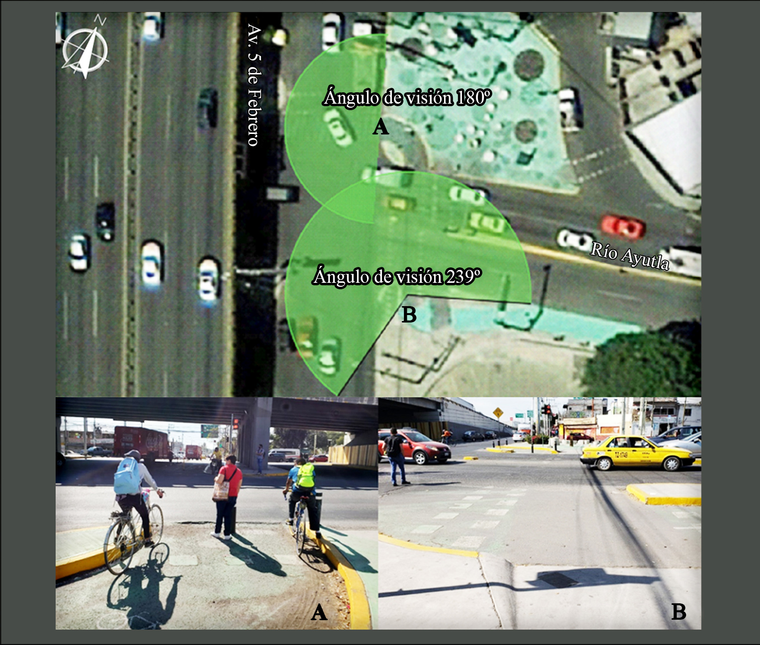 En la figura 1 se muestra la intersección 5 de febrero/Río Ayutla (1E), la cual une el lado oeste y el este de la ciudad. Es muy concurrida con un VHMD (volumen horario de máxima demanda) de 3 846 vph (vehículos por hora), en la cual se encontró una gran presencia de autobuses, automóviles, motocicletas, bicicletas e incluso vehículos pesados. Cuenta con semaforización exclusiva para ciclistas con tiempos de espera de entre 100 y 130 s. El carril bicicleta está al lado de la calzada y no se mezcla con los vehículos de automotor.