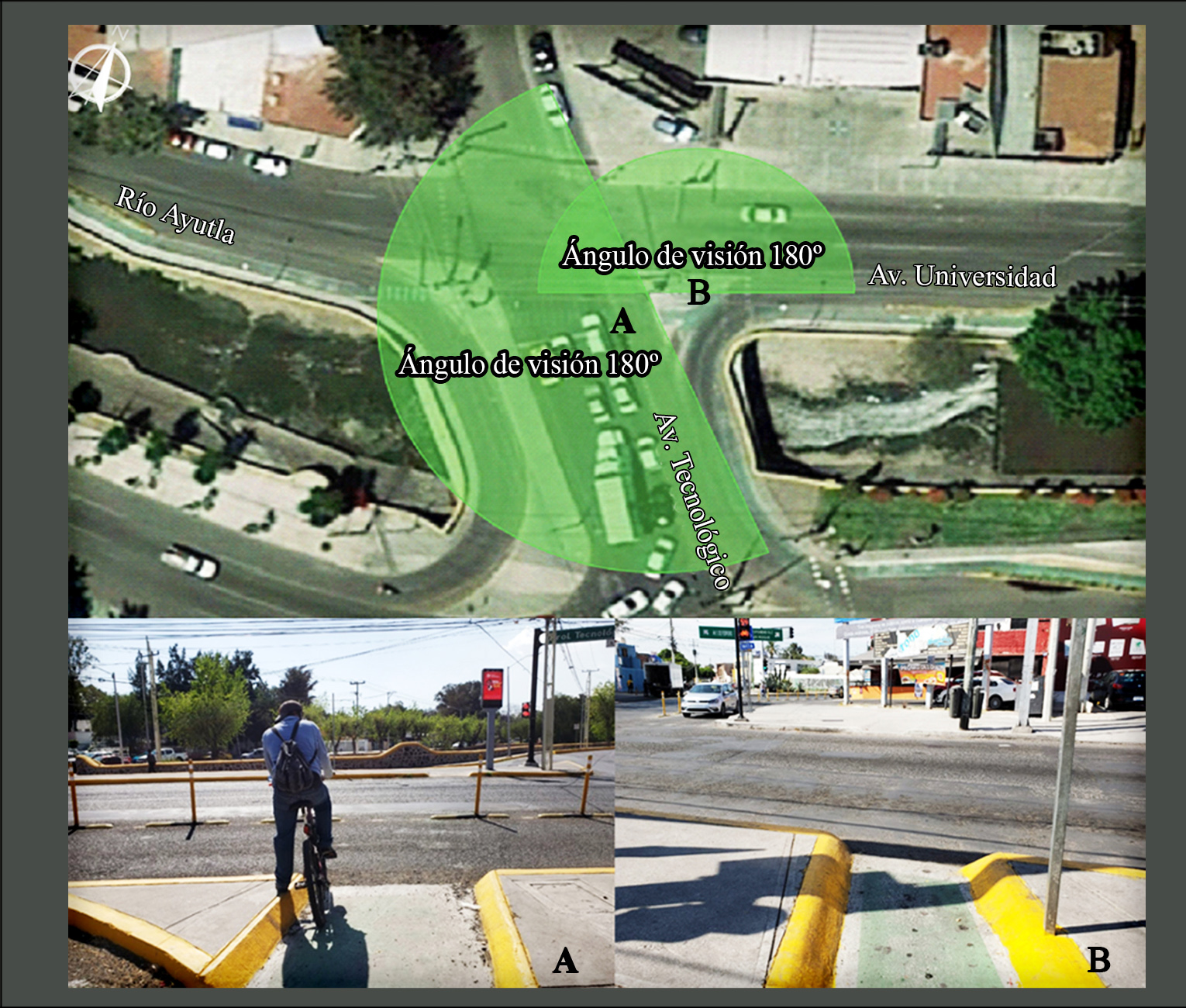 En este apartado se describen los sitios observacionales. Se incluye el volumen horario de máxima demanda obtenido, características de la infraestructura, así como imágenes de planta y punto de vista del ciclista (el campo de visión fue calculado a través del software AutoCAD). De igual manera, se externa si el semáforo presente corresponde a un semáforo exclusivo (E) o un semáforo mixto (M).