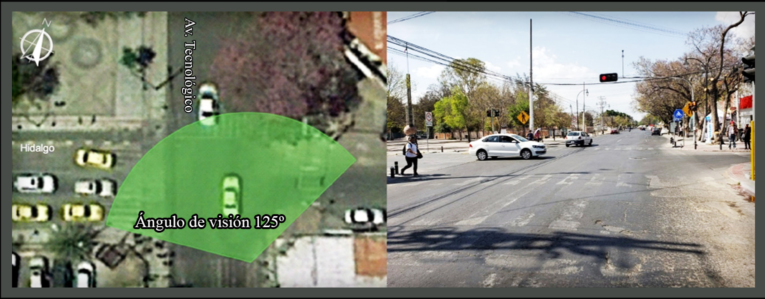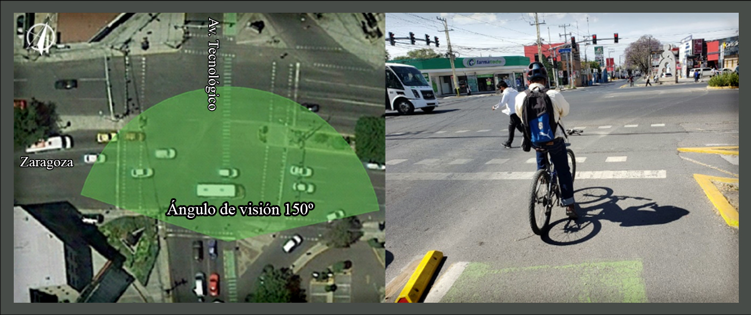 Por último, en la figura 4 se presenta la intersección Tecnológico/Zaragoza (4M), la cual une el lado norte y el sur de la ciudad y es el cruce de una de las avenidas principales de la ciudad con altas demandas. Cuenta con varios puntos de interés cercanos como hospitales, restaurantes o paradas de autobuses. Es una intersección concurrida con un VHMD total de 3 446, la cual exhibe gran presencia de autobuses, automóviles, motocicletas y bicicletas. El semáforo es mixto, ya que el carril bicicleta se mezcla con los vehículos de automotor y el tiempo de espera es de 70 s.