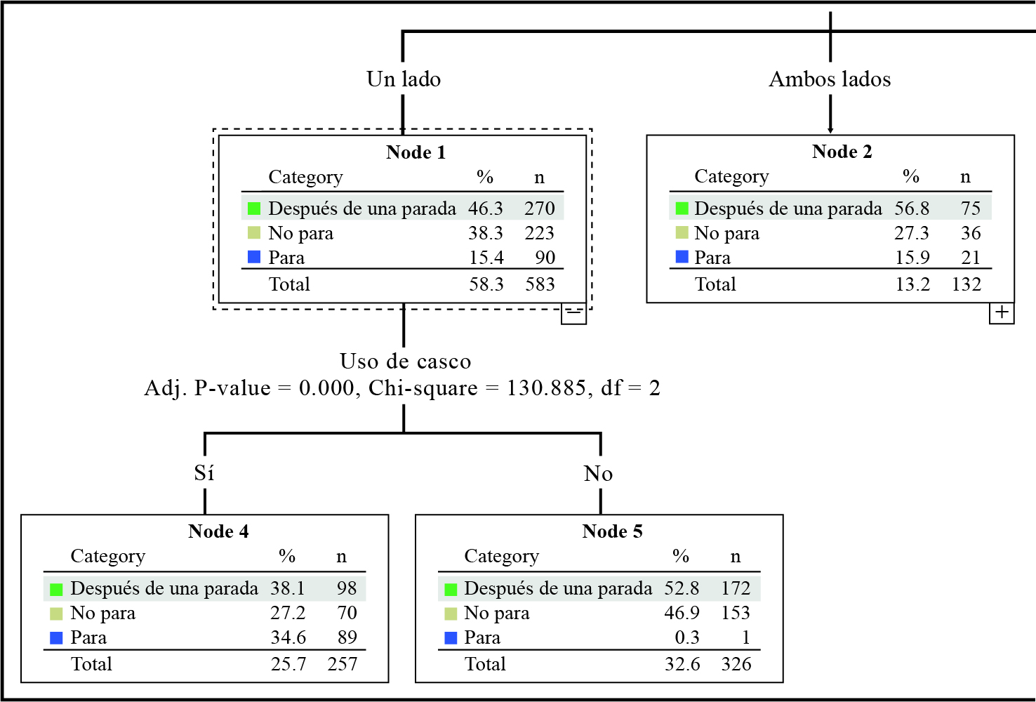 El diagrama sigue un conjunto de reglas de decisión aplicadas en secuencia. El árbol de clasificación termina por sí mismo cuando no hay otras particiones asociadas significativamente con el nodo, es decir, el nodo terminal (Fraboni et al., 2018). De acuerdo con la figura 5, la segunda partición termina en el nodo 5, en donde se observa que los ciclistas que usan casco son más propensos tanto a esperar en luz roja, o bien a cruzar en luz roja después de una parada.