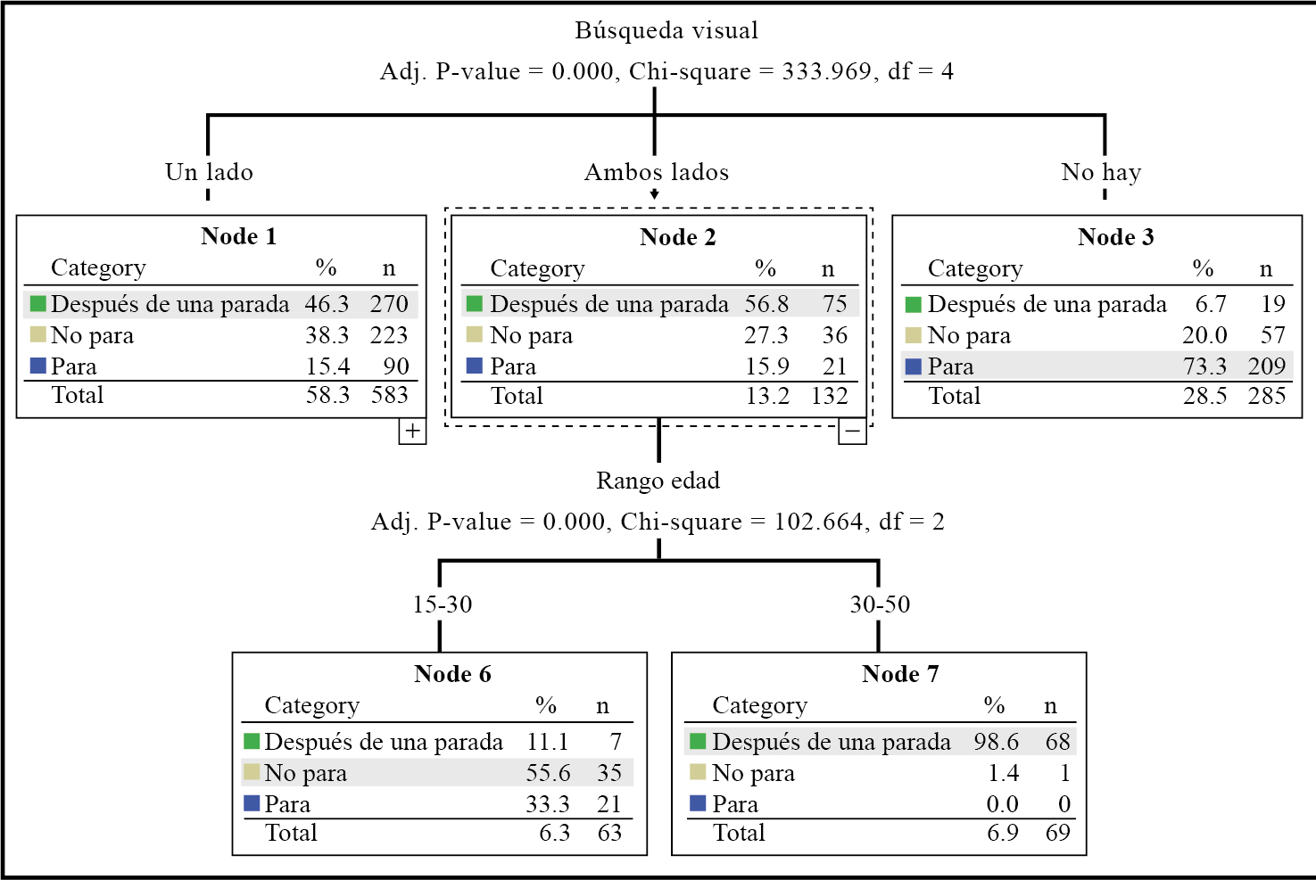 Para una mejor comprensión del comportamiento en intersecciones semaforizadas, se presenta el diagrama de árbol, el cual considera todas las variables estudiadas. De acuerdo con la clasificación del comportamiento, para la primera partición, se incluye el nodo raíz (nodo 0) y la muestra de un total de mil ciclistas repartidos en tres nodos subsecuentes correspondientes al empleo de búsqueda visual: a) 583 lo hicieron hacia un lado, b) 132 para ambos lados, de los cuales 75 cruzaron la luz roja después de una parada, y c) 285 ciclistas no lo hicieron, de los cuales 209 esperaron en luz roja.