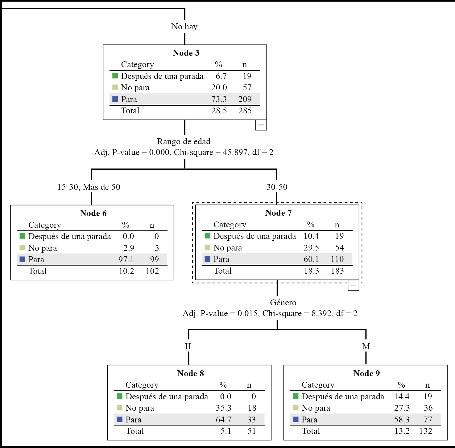 La figura 7 corresponde a la cuarta partición del diagrama. El nodo 3 muestra el no empleo de búsqueda visual y en su mayoría son ciclistas de entre 30-50 años. Finalmente, en el nodo 9, se observa que alrededor de un 60% se trata de mujeres que se detienen en la intersección.