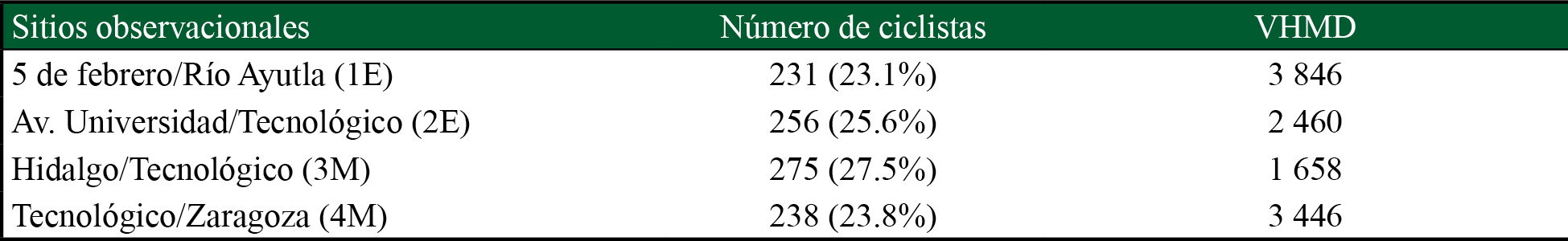 Cuadro 1 Ciclistas por sitio observacional y VHMD