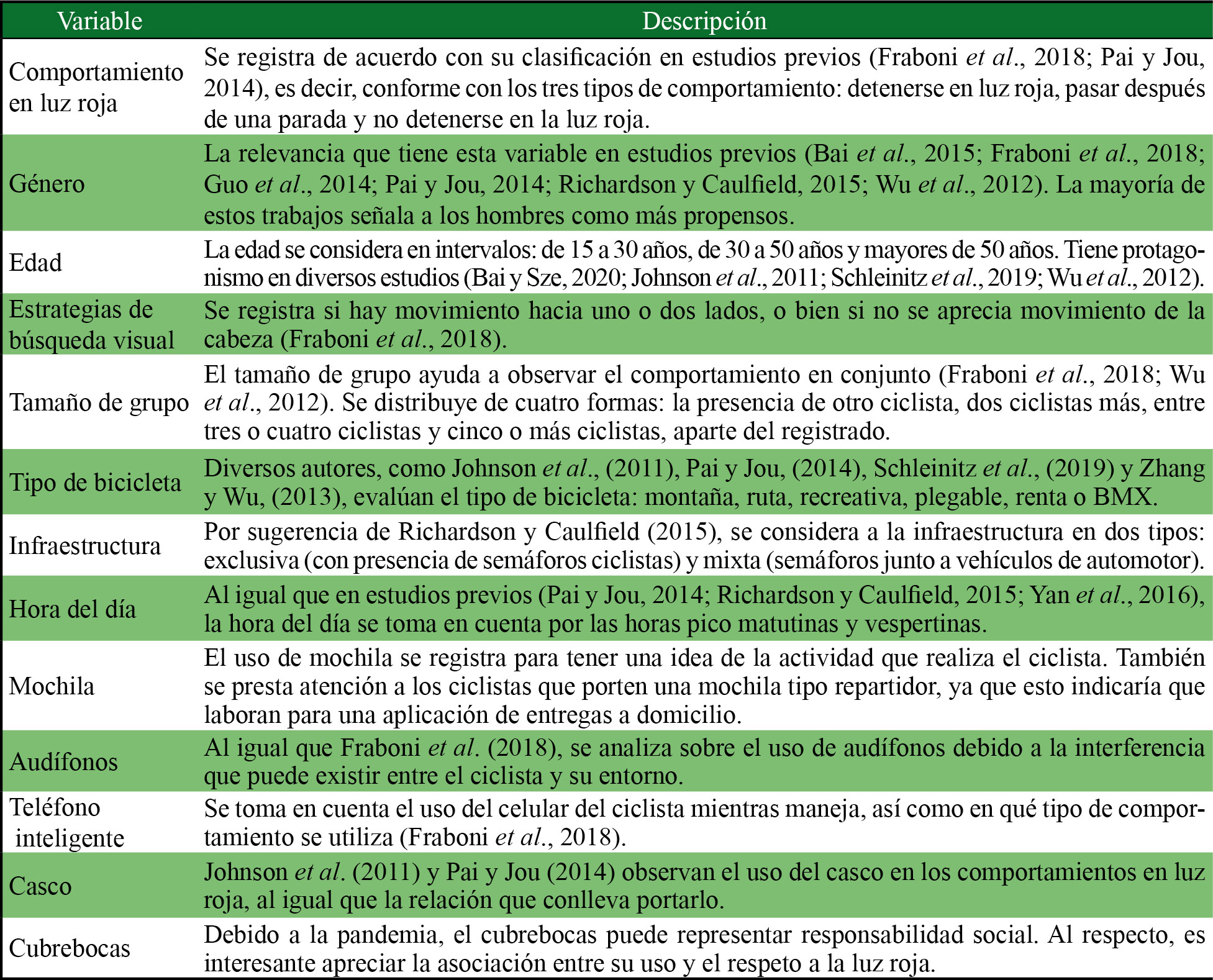 | Casco | Johnson et al. (2011) y Pai y Jou (2014) observan el uso del casco en los comportamientos en luz roja, al igual que la relación que conlleva portarlo. |