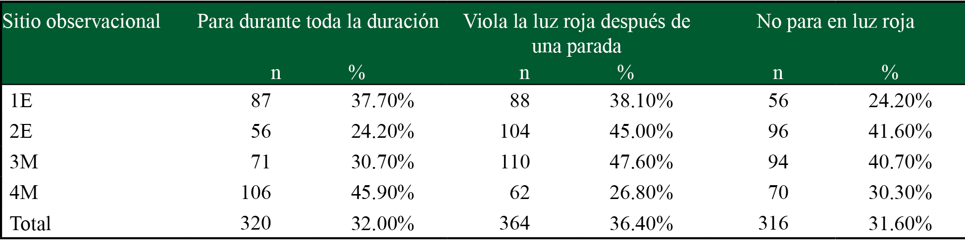| Sitio observacional | Para durante toda la duración n % | Viola la luz roja después de una parada n % | No para en luz roja n % | |||