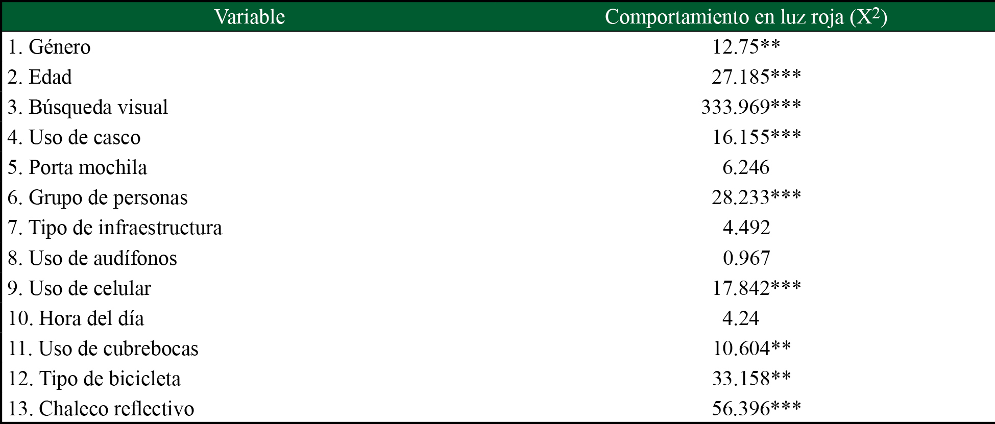 En la tabla 3 se muestran los resultados para la chi-cuadrada. Se aprecia que existe una dependencia estadística de las variables de donde se obtienen como resultados que el género y la edad tienen una gran importancia. En este tenor, los hombres de entre 15 y 30 años son más propensos a cruzar la luz roja, ya sea después de una parada o de no parar en ella. Por su parte, la búsqueda visual es determinante a la hora de cruzar la luz roja, aunque suelen ser más los casos en donde sólo se voltea a un lado, que es hacia el sentido contrario de circulación de los vehículos motorizados. El tamaño del grupo de personas es una característica básica en aquellos ciclistas que optaron por cruzar después de una parada.