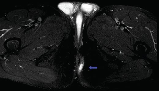 Figura 1 Resonancia magnética pélvica (imagen ponderada en T2) que muestra una fístula transesfinteriana anterior con una pequeña colección hiperintensa en el pliegue interglúteo (flecha).