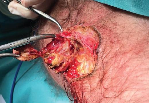 Figura 2 Exploración quirúrgica. Se observan dos orificios fistulosos externos, uno localizado a las 2 horas (flecha), con signos de abscesificación (asterisco), y otro a las 7 horas en litotomía (flecha). Así mismo, asociaba un orificio pilonidal en la región coccígea (círculo).
