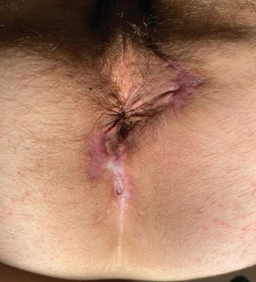 Varón de 39 años, sin cirugías anales previas ni otros antecedentes de interés, valorado en consulta por un cuadro de supuración perianal intermitente de 1 año de evolución. En la exploración física presentaba un orificio fistuloso externo (OFE) localizado a las 2 horas, a 3 cm del margen anal en posición de litotomía, con supuración activa y sin alteraciones en el tacto rectal. Las imágenes ponderadas en T2 de la resonancia magnética (RM) pélvica (Fig. 1), aparentemente, mostraron una fístula transesfinteriana anterior con una pequeña colección hiperintensa en el pliegue interglúteo. Ante la sospecha de fístula anal se realizó una exploración quirúrgica (Fig. 2), observando un OFE localizado a las 2 horas, con signos de abscesificación, y otro OFE a las 7 horas en litotomía. Así mismo, asociaba un orificio pilonidal en la región coccígea. Se canularon los OFE y se inyectó peróxido de hidrógeno, sin evidenciar comunicación con el canal anal en la anuscopia, al contrario de lo que sugería la RM. El OFE a las 2 horas comunicaba con la cavidad abscesual y el OFE de las 7 horas comunicaba con la fosita pilonidal posterior. Se realizaron fistulotomías, que mostraron cavidades pilonidales crónicas, con gran contenido piloso y de granulación (Fig. 3). Se efectuaron escisiones completas de las cavidades pilonidales y posterior marsupialización de los bordes para favorecer el cierre por segunda intención. Al mes y medio de la intervención (Fig. 4), el paciente se encontraba asintomático, con una correcta cicatrización de las heridas quirúrgicas. Tras 2 años de seguimiento, el paciente no muestra datos de recidiva.
