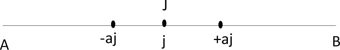 Ahora bien, exponiendo la matemática detrás del tratamiento de la información, aplicando los conceptos definidos y el modelo, si sobre una línea recta se señala un punto “j” arbitrario, pero que al cálculo se encuentra que tal corresponde al límite J, la justicia, y se coloca a ambos lados de “j” (el límite calculado), a la longitud “aj” (siendo esta la argumentación jurídica), sin importar lo pequeño que ésta “aj” sea, entonces se observará que los puntos determinados por n caerán todos, finalmente, dentro del segmento que corresponde al intervalo [ j-aj , j+aj], que es el intervalo en el que, tanto el litigante como el juzgador, se mueven en la exploración para alcanzar la justicia, tal como se aprecia en la siguiente figura: