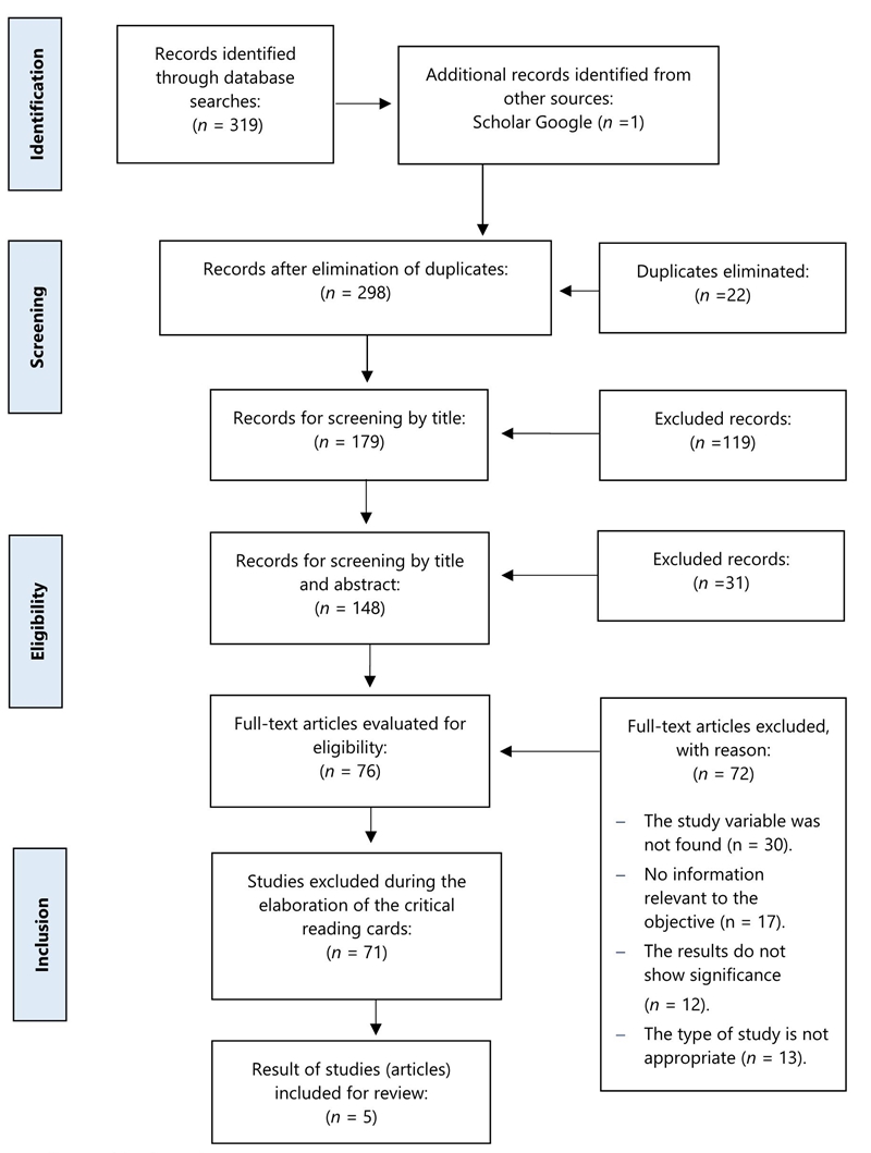 When screening by title, 119 articles were excluded because the variables contained in the title were not related to the topic; when screening by title and abstract, 31 articles were eliminated because they did not address the migrant population completely; when full-text screening was performed, 72 articles were eliminated because the method used did not correspond (non-migrant population and study objective with a variable other than self-esteem); when the critical reading cards were made, 71 articles were eliminated because the study was not related to the objective of the review; the result was 5 articles to review (see Figure 1). It should be noted that the screening performed always considered the variables of interest; also, the quality of evidence was evaluated using the STROBE (Strengthening the Reporting of Observational Studies in Epidemiology) tables, which allowed the identification and evaluation of the methodology and structure of the selected articles. Cards were also used to document the critical reading (See Figure 1).