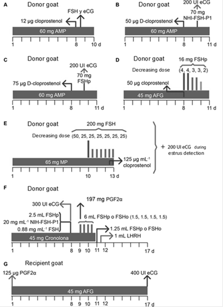 Avelar et al. (2012) synchronized donor goats using an intravaginal sponge with 60 mg of AMP (Syntex, Buenos Aires, Argentina) for 11 d, and on day eight, they injected 50 μg of d-cloprostenol (Ciosin, Coopers, São Paulo, Brazil). For ovarian stimulation, the goats were divided into three treatments: 1) 120 mg of NIH-FSH-P1 (standard swine FSH, National Institute of Health for standard FSH, Folltropin-V, Vetrepharm, Belleville, Canada), given in five injections (5D) intramuscularly (30, 30, 20, 20, and 20 mg, respectively) with intervals of 12 h; 2) 120 mg of NIH-FSH-P1 divided into three injections (3D) with intervals of 24 h (60, 40 and 20 mg, respectively); and 3) a single injection (1D) of 70 mg of NIH-FSH-P1 plus 200 IU of eCG (Novormon, Syntex, Buenos Aires, Argentina), 36 h before removing the sponge.