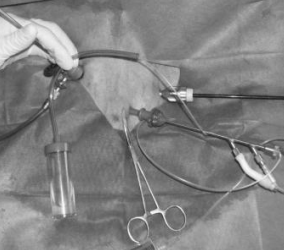 The endoscope is inserted 2 to 3 cm cranial to the mammary gland, and 2 to 3 cm to the left of the midline in the abdominal cavity through a first trocar; a second trocar is inserted in the right side of the abdomen (opposite to the first) to introduce the applicator-tracer, with which the uterus is located. Next, a third trocar is inserted in the midline, in order to pass the oocyte retrieval needle (Souza-Fabjan et al., 2014). Once the three trocars were inserted and the laparoscope was inserted, the atraumatic clamp and the aspiration pipette, follicular puncture was performed (Cortez-Romero et al., 2011, Figure 2).