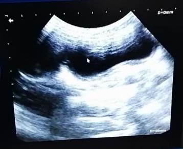 En el hemograma se observó leucocitosis de 28.8 x 103 células/µL (IDEXX VetAutoread®), mientras que en la química sanguínea se observó un aumento de las proteínas totales 11.7 mg/dL y la globulina 8.9 g/dL así como una disminución del colesterol 32 mg/dL y la alanina aminotransferasa < 10 U/L (IDEXX Catalyst One®). Para la realización del ultrasonido se hizo uso de un equipo EDAN DUS 60 VET®, (Figura 2) en el que se observó contenido anecoico abundante en el lumen de ambos cuernos uterinos y un engrosamiento de la pared uterina, descartando así la probabilidad de gestación temprana.