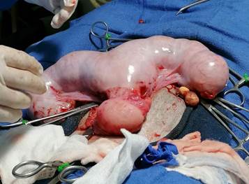 Para la resolución de la piometra se sometió a la hembra de leopardo a una oforosalpingohisterectomía (OSH) abierta de emergencia (Figura 3), en la cual se observaron múltiples adhesiones en la vejiga, por lo que se realizó lavado peritoneal. La cirugía duró aproximadamente tres horas, no hubo complicaciones durante la recuperación anestésica. El peso final del útero fue de 0.97 kg, presentaba las paredes engrosadas y contenido sanguinopurulento (Figura 4). Se realizó un cultivo bacteriológico de secreción uterina, haciendo uso de agar sangre (Scharlau) y MacConkey, una vez que se desarrollaron las colonias, se procedió a la identificación de género y especie, para lo cual se utilizaron las siguientes pruebas: TSI (Triple Sugar Iron agar), LIA (Lysine Iron Agar), SIM (Sulfide Indole Motility), coagulasa, catalasa, hemolisis, NaCl 6.5 %, bilis esculina, PYR (Pyrrolidonyl Arylamidase), arabinosa y telurito, dando como resultado la identificación de Enterococus faecalis (Hervé & Porte, 2007; Díaz et al., 2013).