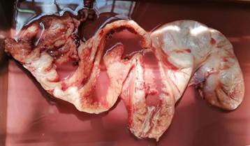 Figura 4 Útero con incisión en el cuerpo y cuerno uterino. Se observa las paredes engrosadas y el contenido sanguinopurulento