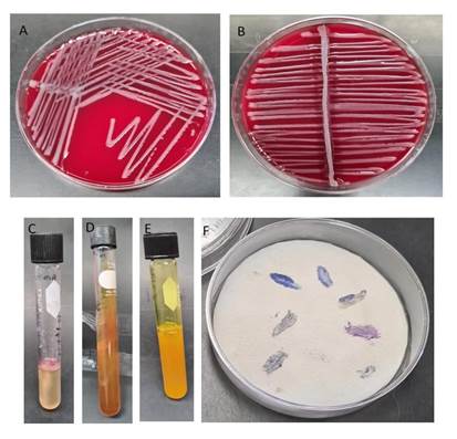 Figura 1 Pruebas bioquímicas aplicadas para la identificación de P. multocida aislada del hisopado nasal de la coneja cabeza de león. A) Cultivo puro en placa con agar sangre sin hemólisis. B) Prueba de hialuronidasa positiva. C) Prueba de SIM; indol positivo, producción de ácido sulfhídrico negativo y motilidad negativa. D) Prueba TSI; producción de gas negativo, producción de ácido sulfhídrico negativo y fondo y superficie amarillos. E) Prueba de acriflavina negativa. F) Prueba de oxidasa positiva.