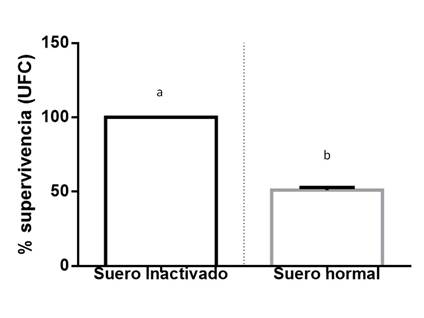 Para los ensayos de supervivencia, la bacteria se subcultivó en agar sangre (AS) por 24 h, posteriormente una colonia fue inoculada en caldo infusión cerebro corazón (CICC) durante 16 h a 37 °C con agitación de 185 rpm hasta que el cultivo alcanzó una densidad óptica de 0.43 a 600 nm (aproximadamente 3.42 × 108 bacterias/mL). Posteriormente fue centrifugado a 4,400 Xg a 21 °C por 15 min, el sedimento bacteriano se lavó una vez con solución salina de fosfatos (PBS) y se ajustó a 1x103 bacterias/tubo. Se utilizó suero humano normal (SN) con complemento activo y para el control el complemento fue inactivado calentando el suero humano a 56 ºC por 30 min (SIC), la concentración final del suero fue del 40%. Las bacterias fueron incubadas con SN o con SIC a 37ºC por 30 min bajo agitación de 190 rpm. Después el cultivo se centrifugó a 5,500 Xg decantando el sobrenadante, la pastilla fue suspendida en 100 µL de PBS, se realizaron diluciones decuples hasta 10-4, para sembrar por extensión en AS por triplicado incubando a 37 °C por 18 h para determinar el número de unidades formadoras de colonias (UFC), se calculó el porcentaje de supervivencia considerando el número de colonias obtenidas tras la incubación con SIC como el 100% de supervivencia.