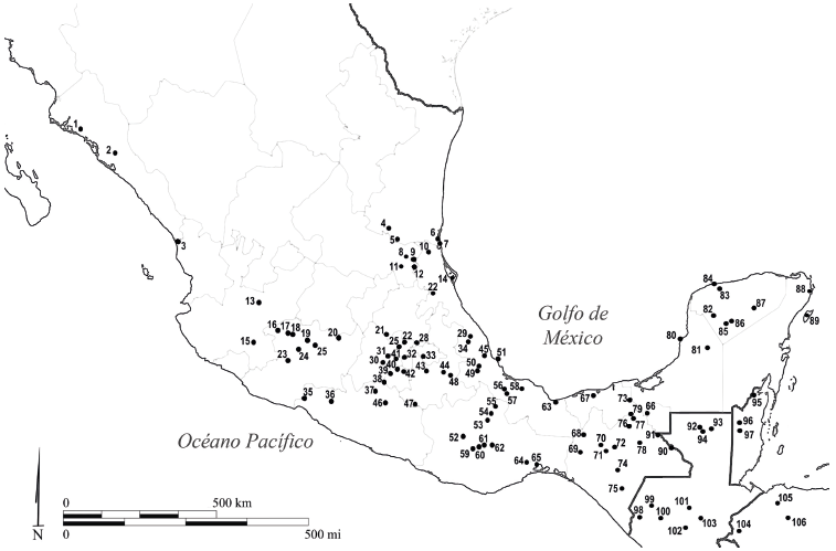 Figura 1 Mapa de distribución de series registradas en la Colección de Modificaciones Dentales Javier Romero (redibujado de Romero 1958 por Rocío Albarrán y Vera Tiesler).