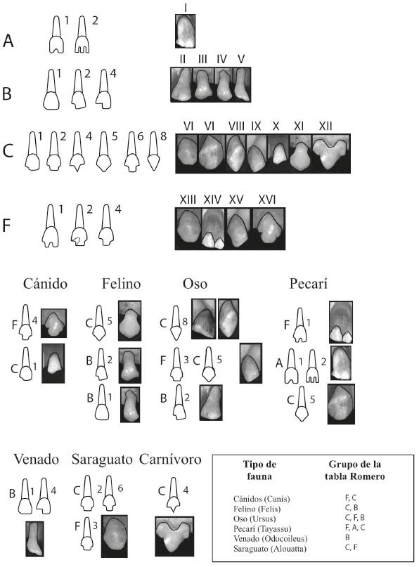 Figura 10 Clasificación de formas de dientes faunísticos según el esquema taxonómico de Romero (1958; retomado y redibujado por Hemmamuthé Goudiaby de Montiel Mendoza et al. 2006: 81-2, figuras 3 y 4). Se ejemplifican los tipos de formas dentales en especies de cánidos, felinos, oso, pecarí, venado y saraguato y se han ordenado según los grupos de reducción sencillos, de 'A', 'B', 'C' en la tabla de Romero, y de 'F' entre las reducciones dentales compuestas.
