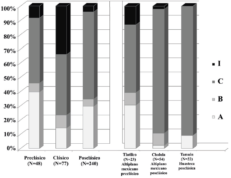 Figura 11 Proporciones de diseños de contornos dentales I, C, B y A durante los periodos Preclásico, Clásico y Postclásico, para los sitios de Tlatilco, Cholula y Tamuín (adaptado de Romero [1958, 1960, 1965, 1986]; gráfico de V. Tiesler).