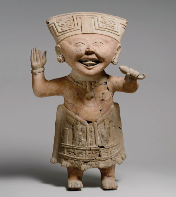 Figura 12 Figurilla con la boca abierta del tipo "cara sonriente" del área de Las Remojadas, Veracruz. Fechada para el periodo Clásico tardío, muestra la lengua prensada desde arriba y abajo entre promontorios centrales ik' (Cat. 1979.206.1211; The Michael C. Rockefeller Memorial Collection, Bequest of Nelson A. Rockefeller, 1979).