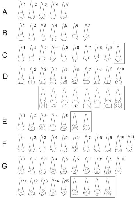 Figura 2 Taxonomía bidimensional de dientes modificados artificialmente (Romero 1986a: 11, fig. 1). Los tipos adicionales, publicados recientemente por otros autores, se enmarcan en recuadros al final de los grupos C, D, E y G (adaptado de Ramírez 2016 y Tiesler 2024; dibujo de R. Albarrán y V. Tiesler; véase Ramírez 2016 y Tiesler 2024 para una revisión sistemática de la literatura reciente). Originalmente desarrollado para los tipos de modificación dental mesoamericanos, los diferentes estilos de otros lugares del mundo, incluyendo formas como la ablación, la fracturación y el teñido, no están bien representados.
