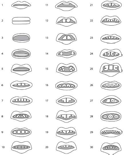Menos concluyente fue el esfuerzo de Romero por sistematizar las líneas artificiales que se esculpían en las denticiones anteriores. En un capítulo entero, Romero (1958) (figura 3) se esmeró por explorar el espectro de los artificios dentales, recurriendo no sólo a las denticiones humanas, sino además a sus representaciones en figurillas e incensarios prehispánicos que muestran la boca abierta. Luego Romero despliega sus exploraciones en un listado de 30 vistas bucales (Romero 1958, 177-97) (figura 3). Con derivados de esta tabla sigue intentando sistematizar los diseños de la reducción dental durante tres décadas, sin llegar a objetivar ni cuantificar las preferencias regionales ni tampoco los giros que los diseños dentales dieron dentro del corpus que lleva su nombre.
