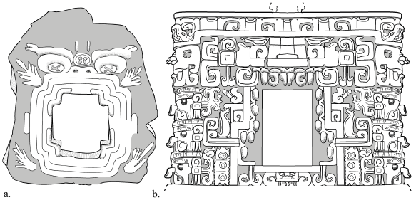 Figura 4 Representaciones bucales en la arquitectura zoomorfa mesoamericana. a) Monumento 9, recientemente repatriado por el gobierno mexicano desde Estados Unidos de América. El lugar de saqueo del altar zoomorfo olmeca se atribuye a Chalcatzingo, Morelos. El portal bucal está enmarcado por cuatro colmillos que forman un motivo cuatrifolio, símbolo omnipresente en la iconografía mesoamericana (adaptado de Guernsey 2010, fig. 3a; dibujo de R. Albarrán). b) Portal arquitectónico de estilo Río Bec que corporiza un monstruo de tierra zoomorfo con una cavidad bucal enmarcada por grandes dientes. Las máscaras de Chahk de mosaico arriba y a los lados muestran líneas de dientes con contornos distintivos (adaptado de Gendrop 1983, fig. 66b; dibujo de R. Albarrán).
