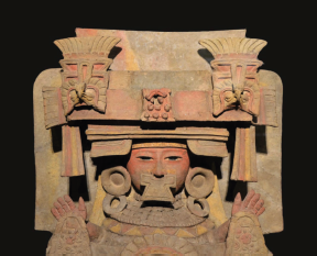 Los incensarios de efigies boquiabiertas, como ejes cósmicos, propiamente "árboles del mundo", corporizan dichas asociaciones bucales al asemejar cuevas anímicamente activas, al canalizar humo, humedad, olor y viento animado (Houston et al. 2006, 271; Taube 1994, 668-9, 1998) (figura 5). Ya desde el Preclásico, la arquitectura y escultura zoomorfa representan portales de comunicación con lo sagrado como lo ejemplifica el Monumento 9 olmecoide de Chalcatzingo, Morelos (figura 4a). El portal bucal del altar zoomorfo está enmarcado por cuatro colmillos en lo que constituye un primicio motivo cuatrifolio, símbolo omnipresente en la iconografía mesoamericana (Guernsey 2010). Siglos después, los portales arquitectónicos de estilo Río Bec corporizan cavidades bucales enmarcadas con grandes dientes y promontorios centrales ik’ al igual que las máscaras de mosaico arriba y a los lados (figura 4b).