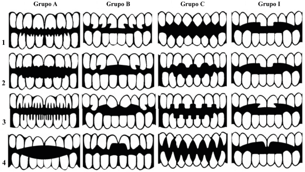 Figura 6 Taxonomía de contornos de arcada dental: con cuatro patrones de grupos A, B, C e I (dibujo de V. Tiesler y R. Albarrán).