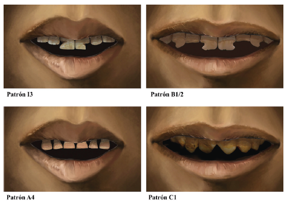 Al poner en contexto las numerosas exploraciones antropológicas sobre el espectro de los antiguos contorneos de las arcadas, emergen al menos cuatro grupos de apariencias dentales. Los grupos de diseño constatados, según sostenemos, siguen distintas formas de corporeización de entes sagrados que a su vez permiten subdividirse en patrones más específicos (figura 6).