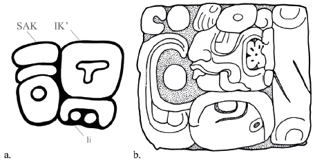 a) Disco de Toniná, Chiapas, México, Museo Nacional de Antropología, Ciudad de México, con signo de fuerza animada sak ik’il, "aliento de la respiración blanca", leído por Erik Velásquez García (dibujo de Hemmamuthé Goudiaby basado en un dibujo de Peter L. Mathews). b) Glifo de K'in de Palenque (acervo dibujos, Linda Schele; redibujado por Hemmamuthé Goudiaby).