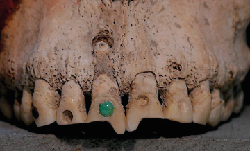 Figura 9 Trabajo dental complejo entre la población enterrada de Jaina, Campeche. a) Contorno de ik' central en forma de tau ("patrón de contorno I4") con incrustación de jade (Entierro CC, 1964, Sección C; Colección Romero 872-876; Dirección de Antropología Física [DAF]/INAH; fotografía por V. Tiesler).