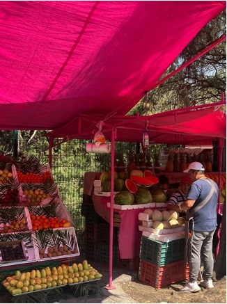 Mónica: “Se organizó que el puesto fuera todo rosa, como por estética, identificar qué son; los uniformes que usan ellos, una bata rosa, se ponen del mismo color que los toldos, que los techos fueran iguales, de la mismas dimensiones, fue iniciativa vecinal, lo de las batitas no sé, van cambiando de colonia, los jueves se ponen acá, los viernes en Palmas, los martes en Las Américas”.
