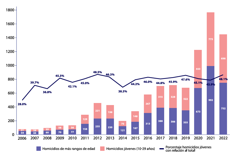 Se habla de juvenicidio porque la muerte violenta de jóvenes es una tendencia que se configura estructuralmente y se refuerza a través de la implementación de políticas militaristas (Bonvillani, 2022; Otamendi, 2019; Valenzuela, 2019), limitando las posibilidades de este segmento poblacional para la construcción de “vidas vivibles” (Butler, 2010, 2020).