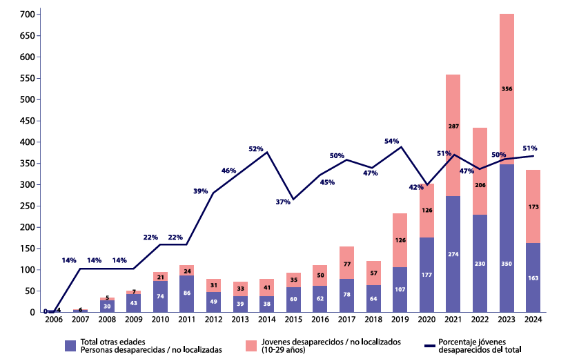 Desde la implementación en México de las políticas de militarización y “combate contra el narcotráfico” por el entonces presidente Felipe Calderón (2006-2012), continuadas y adecuadas por los gobiernos de Enrique Peña Nieto (2012-2018) y Andrés Manuel López Obrador (2018-2024), hubo un aumento dramático en todo el territorio nacional de los homicidios, desapariciones, masacres, desplazamientos forzados, feminicidios, extorsiones y violaciones a los derechos humanos. La implosión y fragmentación de las disputas armadas por el control económico y político de los territorios (Trejo y Ley, 2021), ha dejado como principales víctimas de esta violencia a los y las jóvenes. Como han demostrado diversos estudios, la población que más muere por disparos de armas de fuego en México son jóvenes (Becerra-Romero, 2022; Berlanga, 2015; Otamendi, 2019; Urteaga y Moreno, 2020; Valenzuela, 2019). En el caso de las desapariciones, para julio de 2024 se registraban más de 115,000 personas desaparecidas o no localizadas (según el Registro Nacional de Personas Desaparecidas y No Localizadas de la Comisión Nacional de Búsqueda), de las cuales el 55% de los casos eran víctimas de entre los 10 y 34 años.
