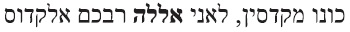 A propósito de “La tarea del traductor” de Walter Benjamin, Derrida (2002, 47) se referirá a la traducción como “transposición poética (Umdichtung)”, en la cual, agrego, se produce (poiein) el texto en su forma trastocada. El filósofo argelino (judío y árabe) se refiere a la verdad que emerge en el acto de traducir (64). Relaciono esa verdad de la traducción con el temor al que alude Kafka en su discurso sobre el jargón, que también se escribe en letras cuadradas. Si el autor de “La tarea del traductor” sentencia que “la versión interlineal del texto sagrado es el modelo o el ideal de toda traducción”, podemos tener una imagen clara de ella en las versiones trilingües (hebreo, arameo y judeo-árabe) del Pentateuco. Pero hay otra forma de la traducción “interlineal” que late en la lengua judeo-árabe y se manifiesta en el Tafsīr de RaSaG. Ahí, el lector ajeno a la tradición árabe judía se encuentra con la traducción del texto sagrado a la lengua profana, pero en letras cuadradas. En esas páginas, en honor al contenido sagrado, el proceso de extrañamiento traductor adopta los términos sagrados de la lengua mayor de acogida: el árabe coránico. Así, en el Tafsīr, correspondiente al fragmento temático “santos” (parašat qedošim) que se encuentra en Levítico 19:2 (“Santos seréis, porque santo soy yo Jehová vuestro Dios”), constatamos la siguiente transformación: