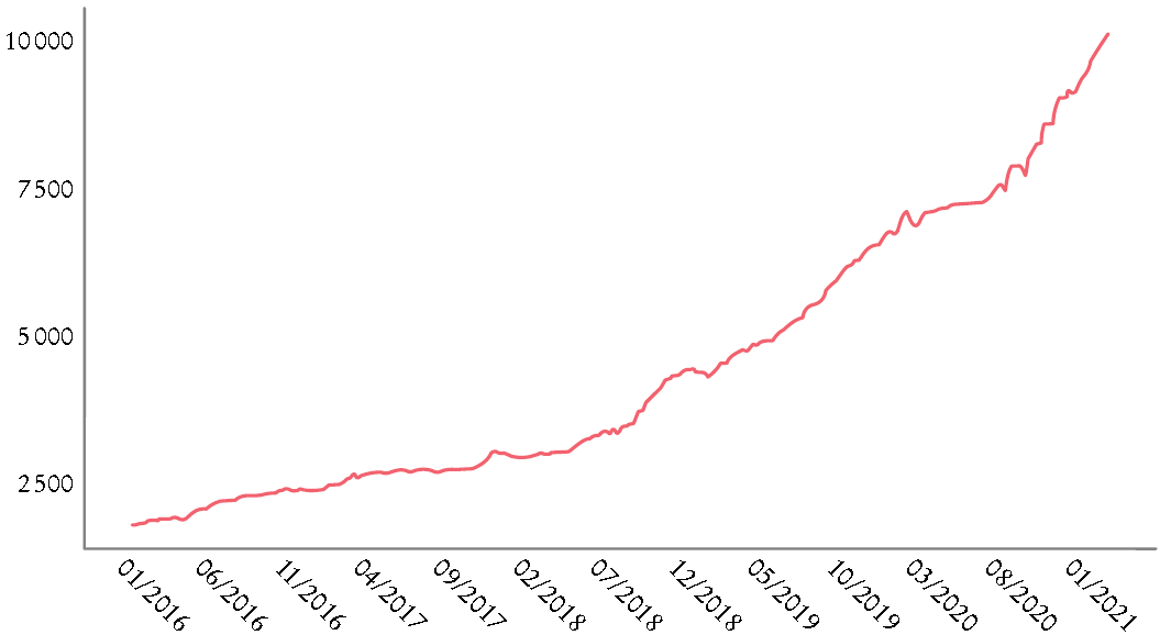 El horizonte temporal considerado abarca desde la primera semana de enero de 2016 hasta la última de febrero de 2021 (248 semanas). La recopilación de datos se efectuó los días 1, 8, 15 y 22 para cada mes. Seleccionar estos días preserva la frecuencia semanal y la cantidad de observaciones resulta similar para todos los meses independientemente de la cantidad de días que posea el mes.