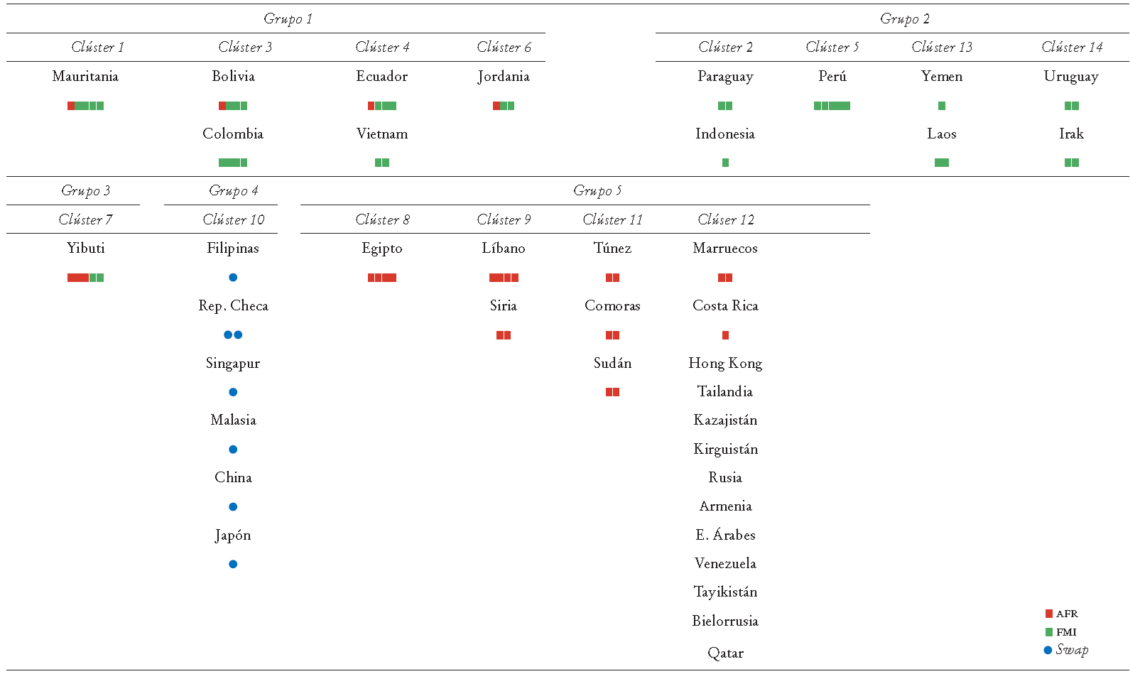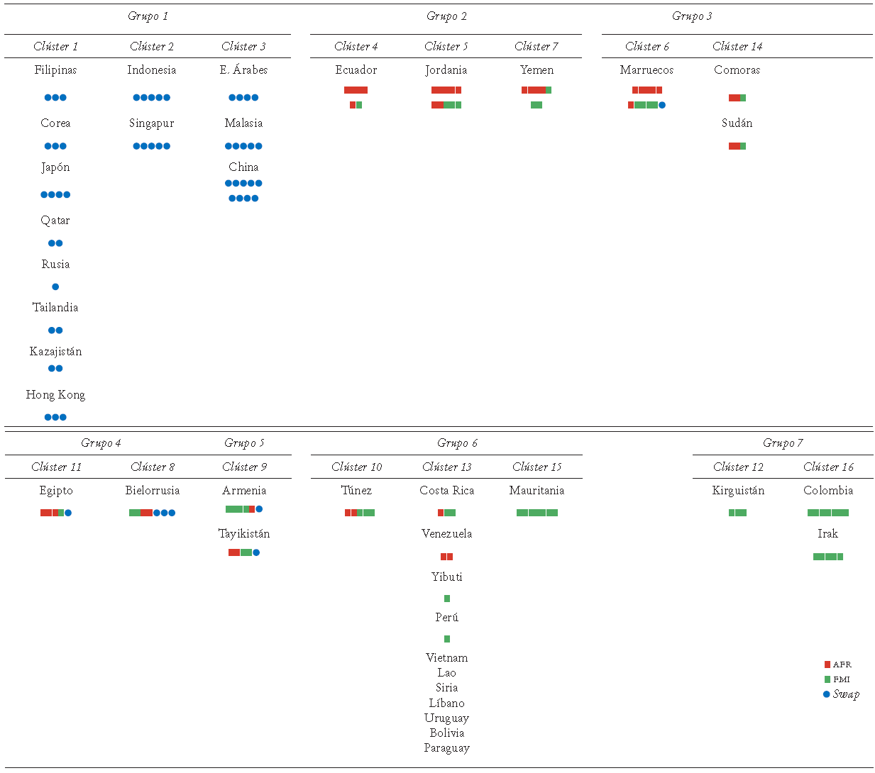 Los grupos 1 y 3 son similares en que ambos recurren a los AFR y al FMI. Aunque la mitad de los países obtiene un financiamiento voluminoso de su AFR, éstos lo combinan con recursos del FMI, posiblemente por razones distintas al volumen del financiamiento. Los grupos 1, 6 y 7 (Mauritania, Jordania y Yibuti) cambian constantemente sus fuentes de financiamiento entre los AFR y el FMI, con diferencias respecto de si éstos accedieron a más recursos del FMA a inicios del 2000 o después. Vietnam y Ecuador recurrieron una o dos veces, respectivamente, a fondos del FMI a inicios de los 2000. Posteriormente, Ecuador accedió exclusivamente a fondos del FLAR. Sólo en los países miembros de este último observamos algunos casos de posible uso sustitutivo de los AFR para evitar acudir al FMI.