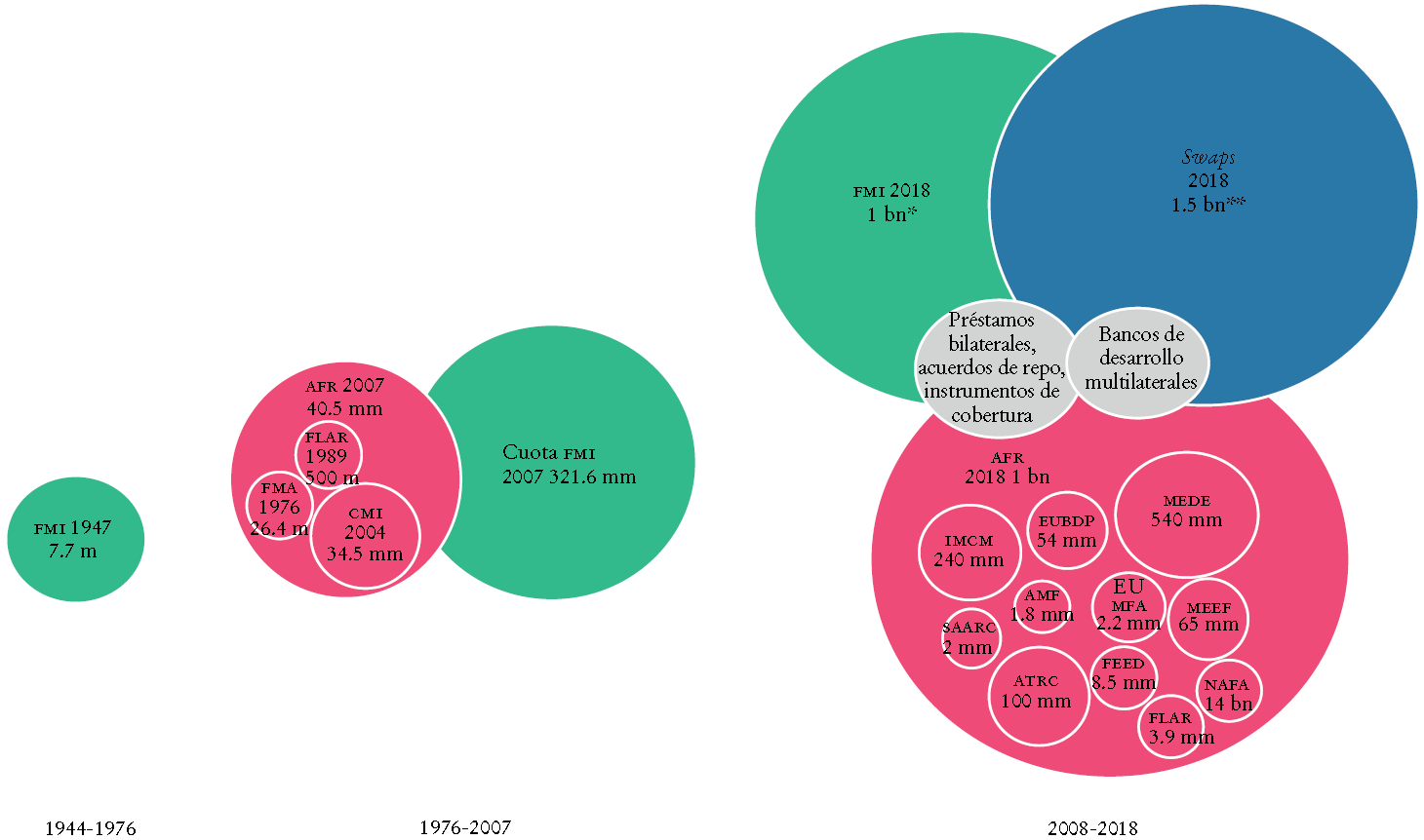 Figura 1 Instituciones, tratados y tamaño de la RMSF (1944-2018, en dólares estadunidenses)a