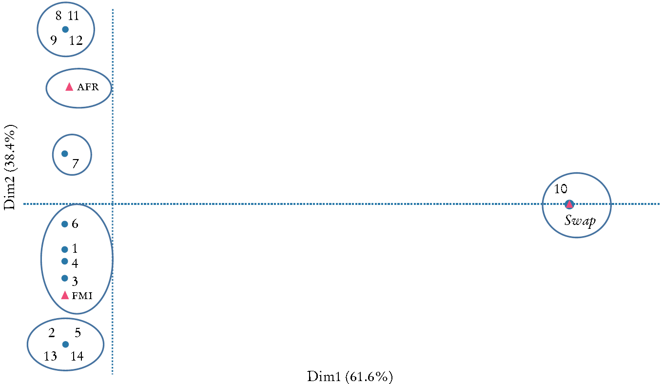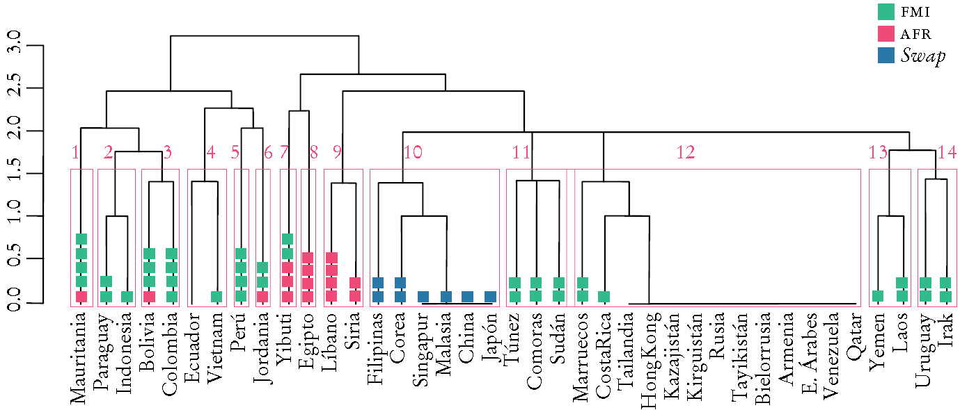 Encontramos el número de acuerdos swap, así como con el FMI y su AFR para cada país dentro de cada clúster. Parte de los clústeres pueden ser identificados en función de la participación en AFR. En el clúster 10 encontramos un grupo selecto de miembros de la IMCM que acordaron tratados swap además de su participación en AFR aun antes de la crisis financiera mundial. El resto de los países miembros de la IMCM recurrió al FMI en 2001 (Indonesia en el clúster 2, Laos y Vietnam en los clústeres 13 y 4) o no contó con ningún financiamiento de emergencia por terceros entre 2001 y 2008.