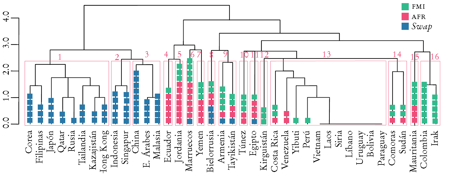 En comparación con el periodo anterior a la crisis financiera mundial, observamos más países que prefieren los acuerdos swap sobre el FMI o los AFR. Los swaps son el recurso dominante (tres clústeres en lugar de uno en 2001-2008). Los países en estos grupos son, en su mayoría, EMED y países miembros de AFR más nuevos y grandes, IMCM y FEED.