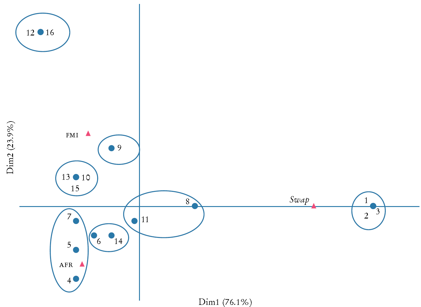 La Figura 3 presenta los 14 clústeres en un espacio bidimensional donde -tras un proceso de reducción dimensional- el eje horizontal muestra el componente con la mayor varianza y el eje vertical el componente con la segunda varianza más grande. Los clústeres están representados por puntos y el uso de uno de los elementos de la RMSF por triángulos. La distancia entre cualquier punto del clúster proporciona una medida de su similitud (o disparidad). Los puntos con un perfil similar se encuentran más cerca unos a otros en este mapa de factores. Los 14 clústeres identificados se clasifican en cinco grupos de acuerdo con su similitud en sus patrones de endeudamiento.