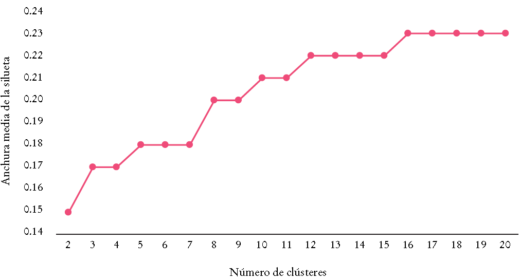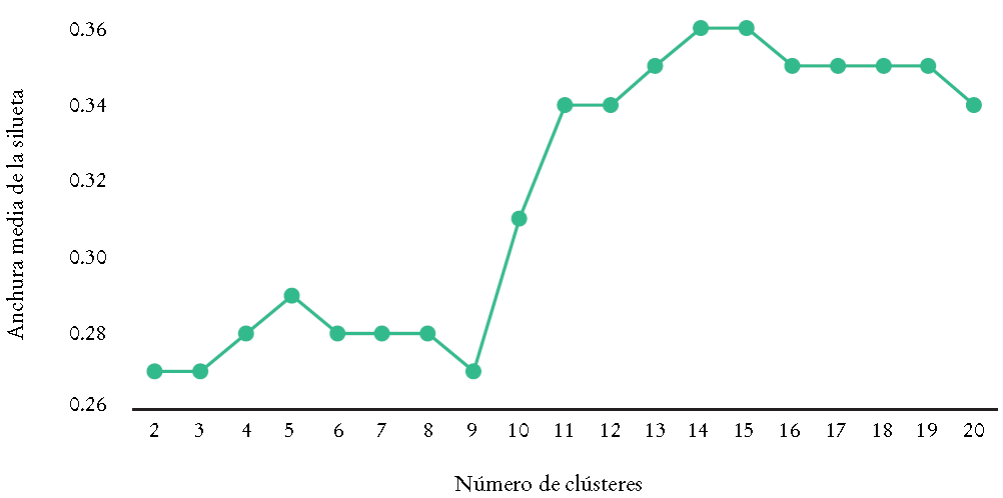 La evaluación de los clústeres está basada en la separación o la distancia entre éstos. Se emplea el método de la silueta para medir la separación entre cada punto de un clúster y los puntos en clústeres aledaños. Entre 2001 y 2008 el coeficiente de la silueta indica que el número más apropiado de clústeres es 14, el cual maximiza el coeficiente de la silueta, lo que implica que cada clúster es lo suficientemente diferente para ser considerado un clúster separado (véase en el apéndice la Gráfica 1A).
